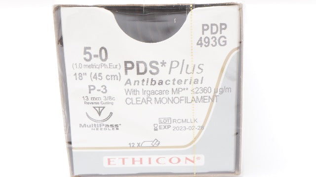 Ethicon PDP493G 5-0 PDS+ Polvdioxanone Stre P-3 13mm 3/8c Ndles 8In-Box of 12