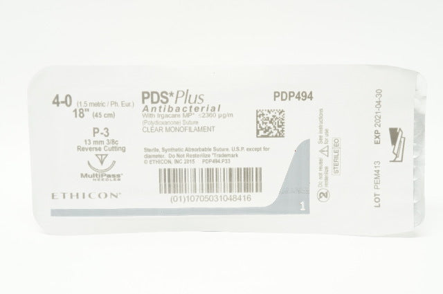 Ethicon PDP494 4-0 PDS Plus Antibacterial with Irgacare MP Polydioxanone Suture Clear Monofilament P-3 13mm 3/8c Reverse Cutting 18inch