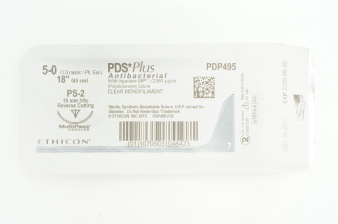 - Ethicon PDP495 5-0 PDS Plus PS-2, 19mm 3/8c Reverse Cutting, 18inch (x)