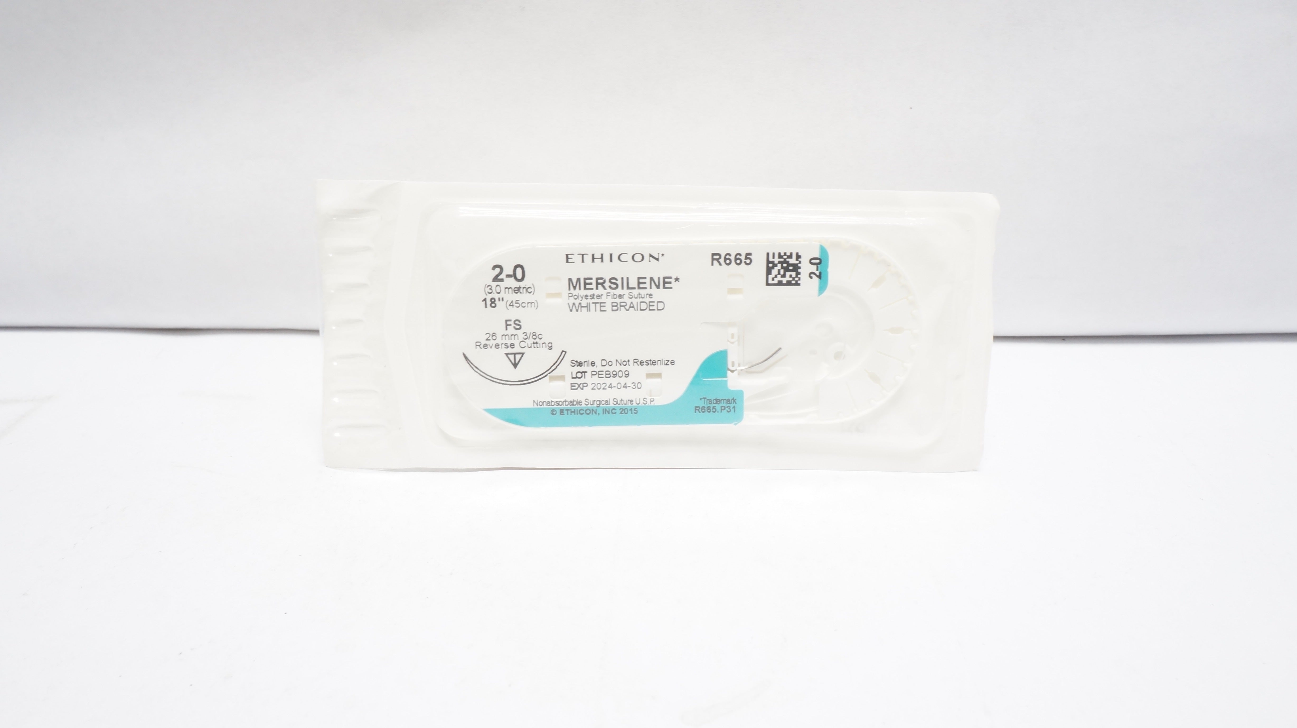 - Ethicon R665 2-0 Mersilene Polyester FS 26mm 3/8c Reverse Cutting 18inch (x)