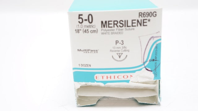 - Ethicon R690G 5-0 MERSILENE P-3, 13mm 3/8c Reverse Cutting, 18inch (x)-Box of 12