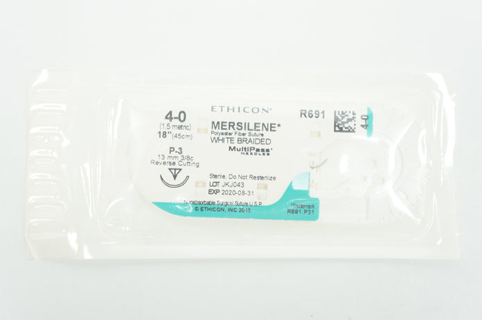 Ethicon R691 Mersilene Polyester Fiber Suture White Braided 4-0 18in P-3 13mm 3/8c Reverse Cutting