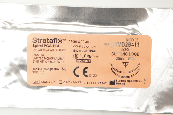Ethicon SXMD2B411 2-0 Stratafix Spiral PGA-PCL Knotless Tissue Control Device Undyed Monofilament Synthetic Absorbable 2xFS Cutting Edge 26mm 3/8c 14cm x 14cm