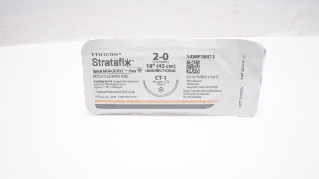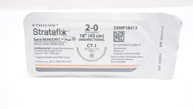 Ethicon SXMP1B413 2-0 Stratafix Spiral Monocryl Plus Knotless Tissue Control Device Antibacterial Undyed Monofilament CT-1 36mm 1/2c Taper 18inch Undirectional