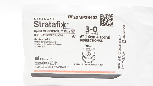 - Ethicon SXMP2B402 3-0 Stratafix Spiral Monocryl + 6In + 6In RB-1 17mm 1/2c Taper
