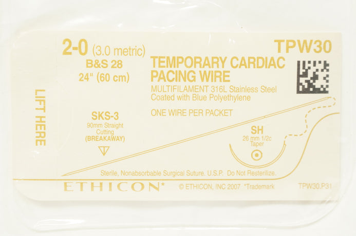 Ethicon TPW30 2-0 Temporary Cardiac Pacing Wire, SKS-3, Straight Cutting Breakaway 90mm,24in