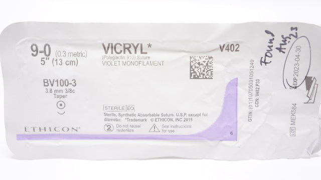 - Ethicon V402 9-0 VICRYL, BV100-3, 3/8mm 3/8c Taper, 5inch (x)