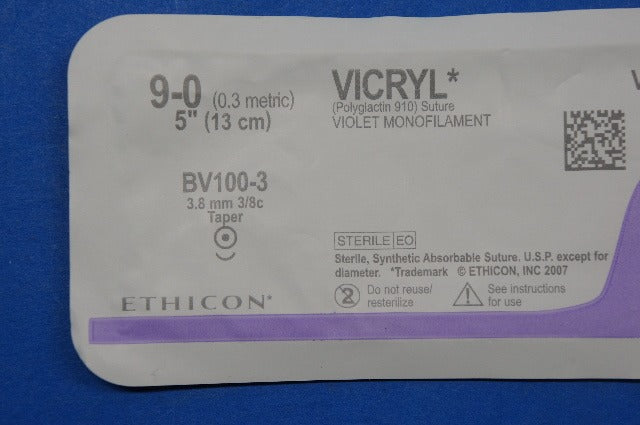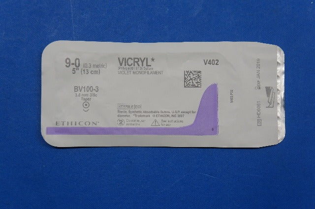 - Ethicon V402 9-0 VICRYL, BV100-3 3/8mm 3/8c Taper, Violet Monofilament, 5inch