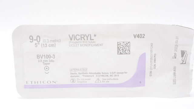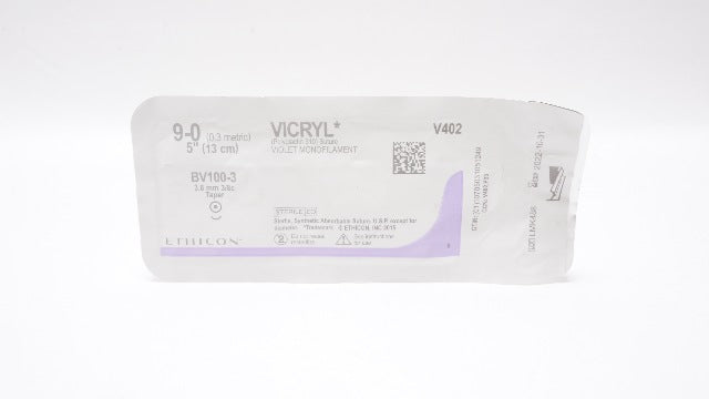 Ethicon V402 9-0 VICRYL Polyglactin 910 Suture Violet Monofilament, BV100-3 3.8mm 3/8c Taper, 5inch