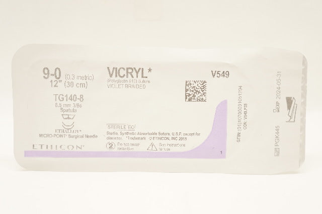 - Ethicon V549 9-0 VICRYL TG140-8, 6.5mm 3/8c Spaula, 12inch