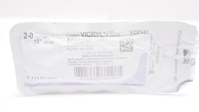 Ethicon VCP111 2-0 Coated Vicryl Plus Antibacterial With Irgacare MP Polyglactin 910 Suture Undyed Braided, 18inch
