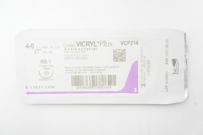 - Ethicon VCP214 4-0 Coated Vicryl Plus Stre RB-1 17mm 1/2c Taper, 27inch (x)