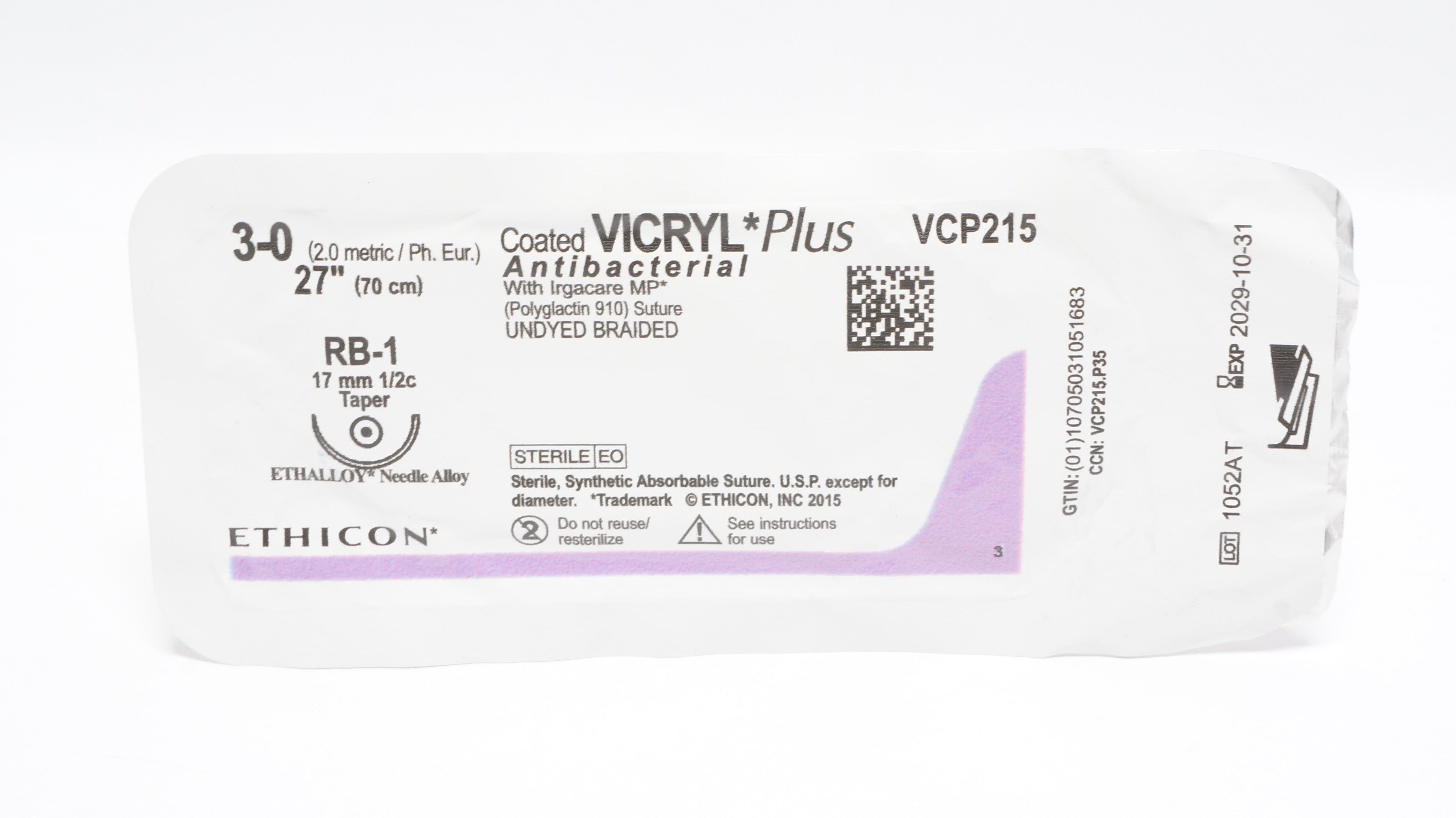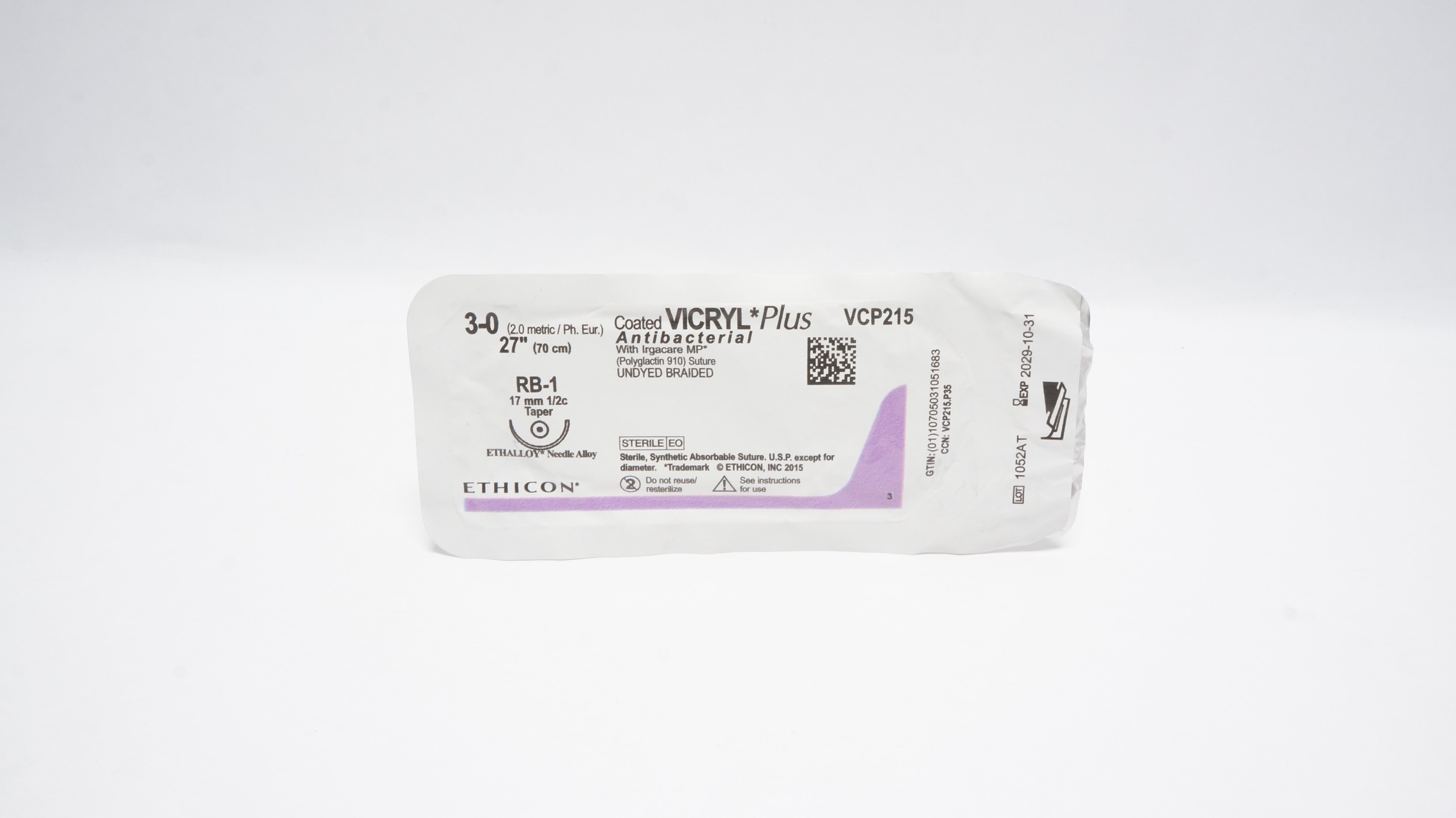 - Ethicon VCP215 3-0 Coated VICRYL Plus Stre RB-1 17mm 1/2c Taper, 27inch