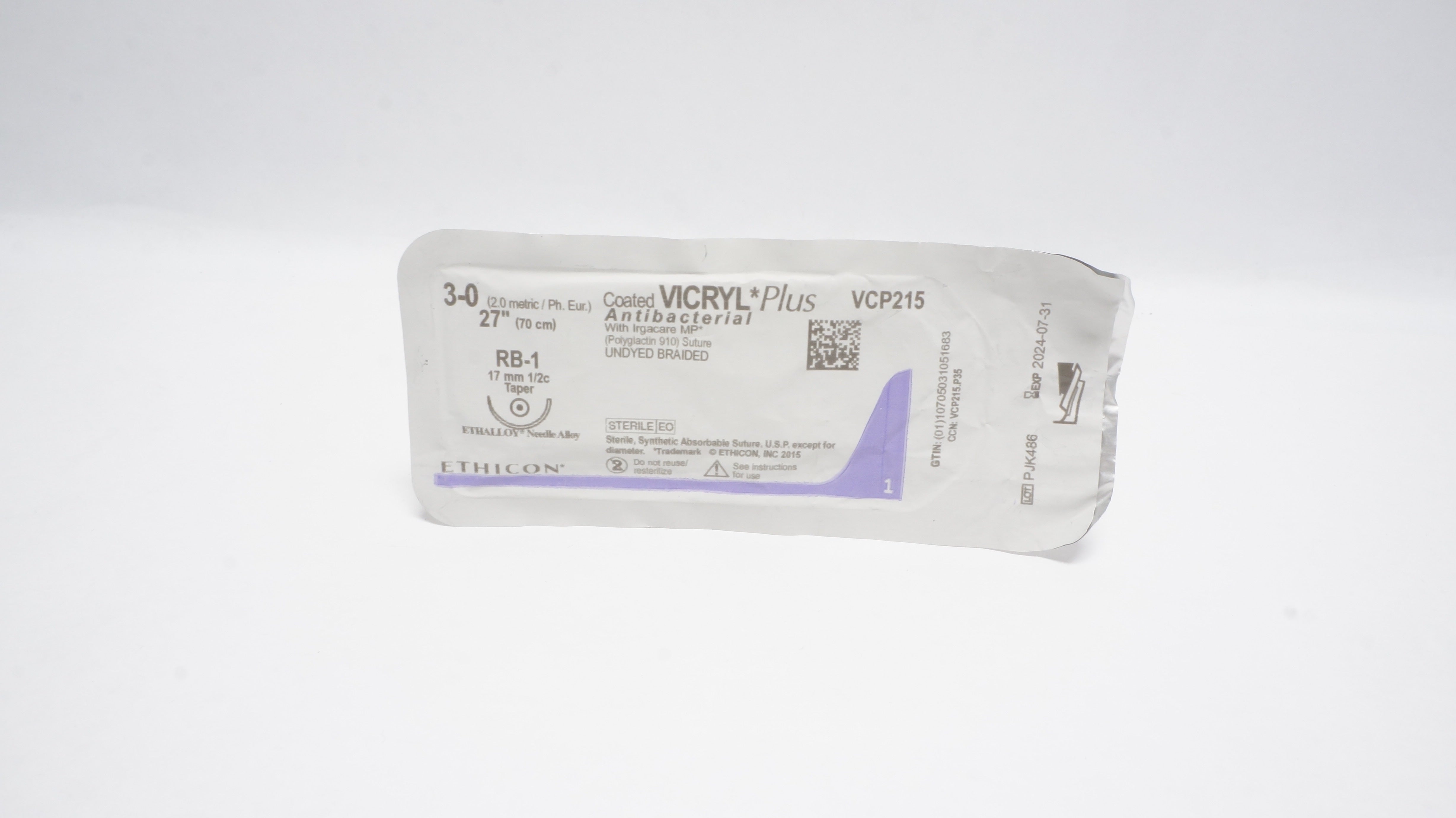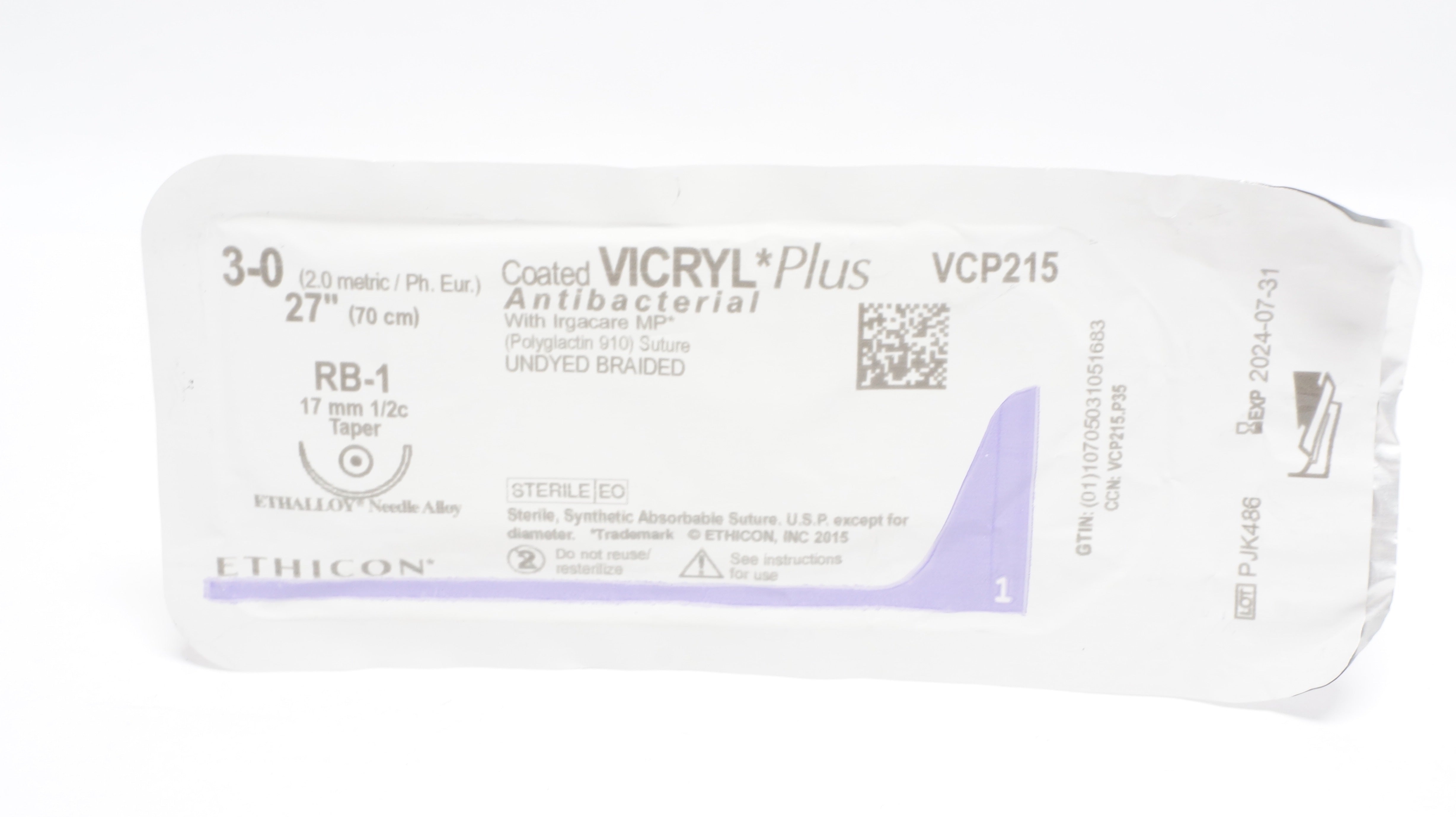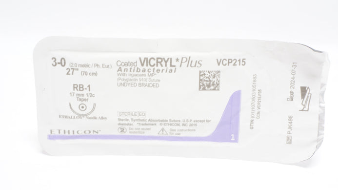 Ethicon VCP215 3-0 Coated VICRYL Plus Stre RB-1 17mm 1/2c Taper, 27inch