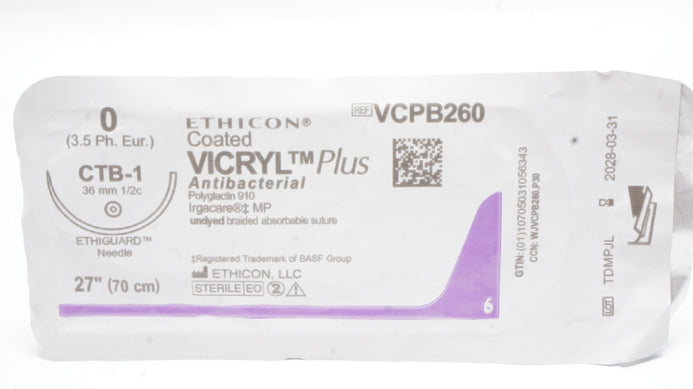 - Ethicon VCP260 0 Coated VICRYL Plus, CT-1, 36mm 1/2c Taper, 27inch