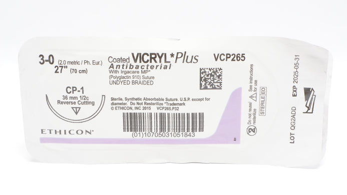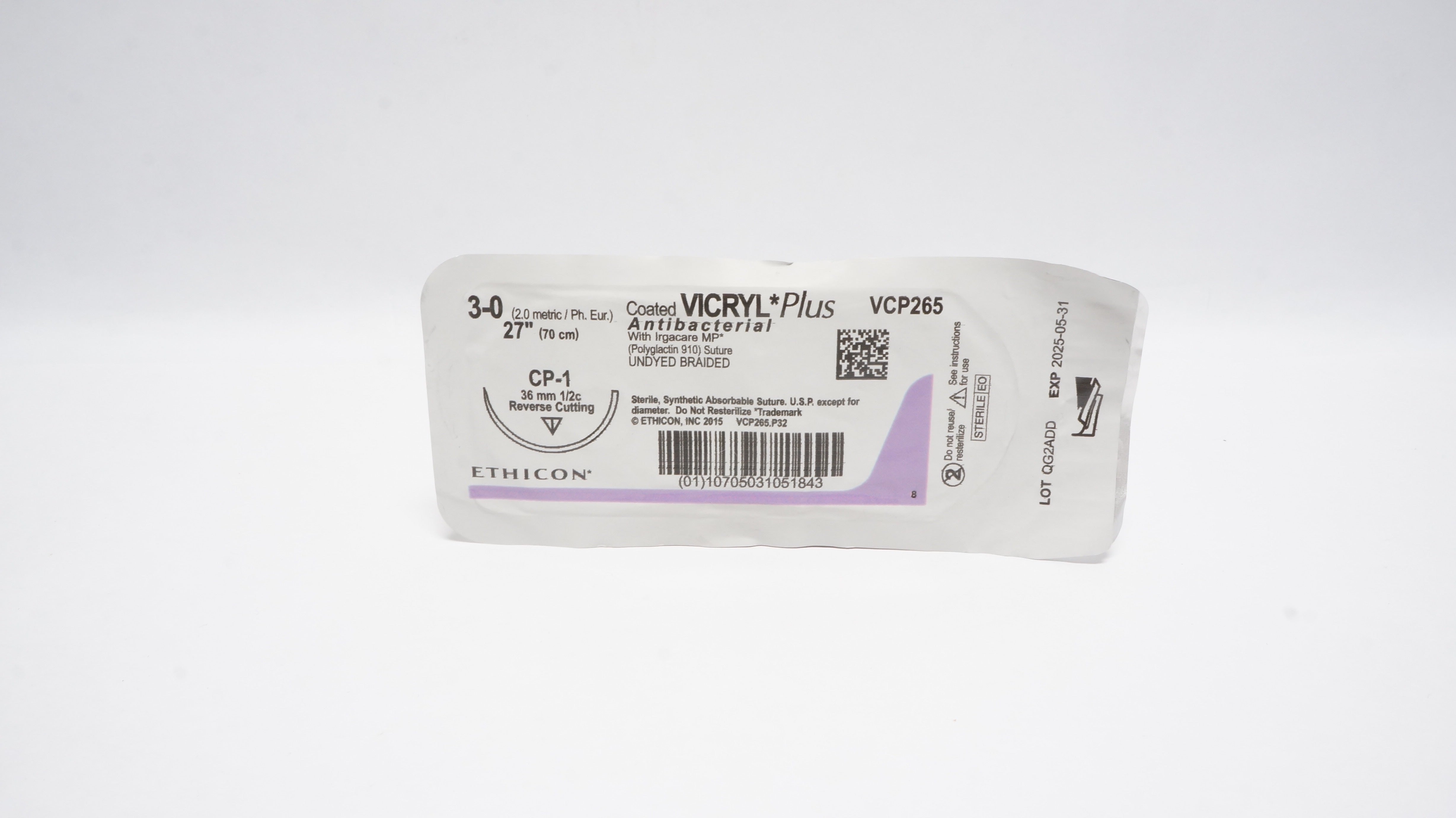 Ethicon VCP265 3-0 Coated VICRYL Plus Antibacterial With Irgacare MP Polyglactin 910 Suture Undyed Braided CP-1 36mm 1/2c Reverse Cutting, 27inch