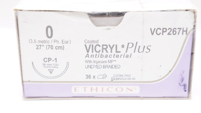 Ethicon VCP267H 0 Coated Vicryl Plus Antibacterial With Irgacare MP Undyed Braided CP-1 36mm 1/2c Reverse Cutting, 27inch