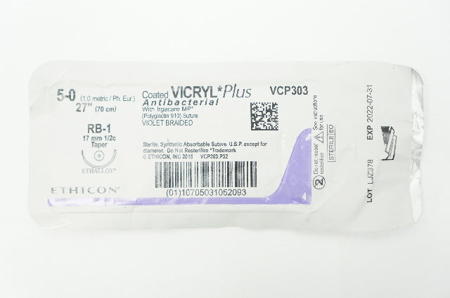 - Ethicon VCP303 5-0 VICRYL Plus RB-1 17mm 1/2c Taper 27inch
