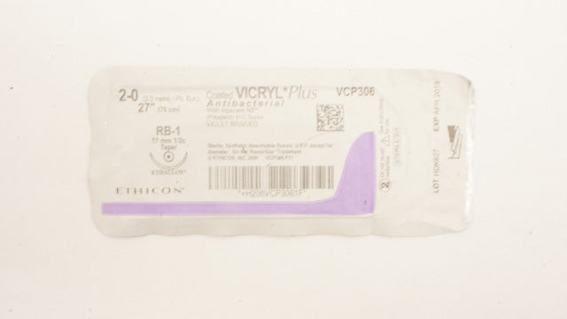 - Ethicon VCP306 2-0 Coated VICRYL Plus Stre RB-1 17mm 1/2c Taper, 27inch (x)