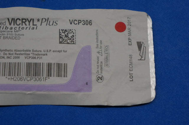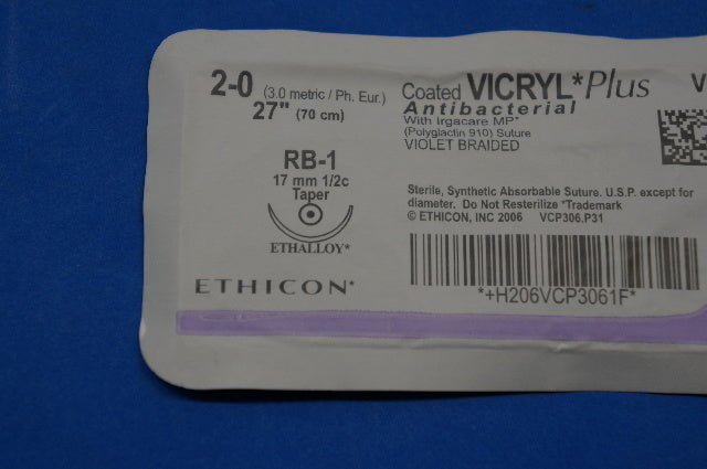 Ethicon VCP306 2-0 VICRYL Plus, RB-1 17mm 1/2c Taper, Antibacterial, 27