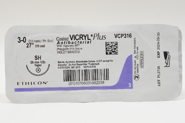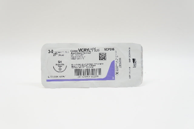 - Ethicon VCP316 3-0 VICRYL Plus, SH, 26mm 1/2c Taper, 27inch