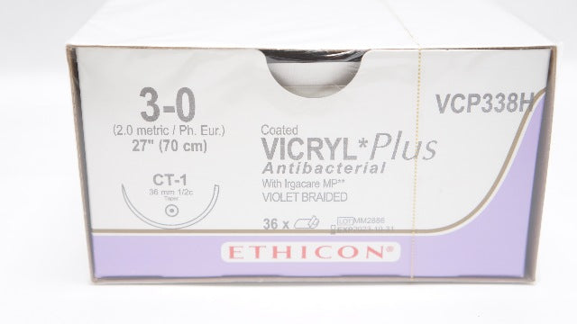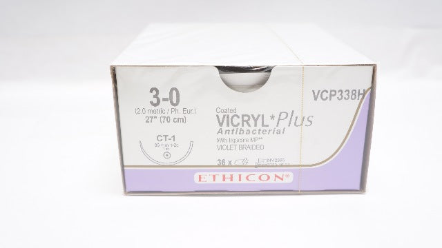 - Ethicon VCP338H 3-0 VICRYL Plus Stre CT-1 36mm 1/2c Taper 27inch (x) - Box of 36