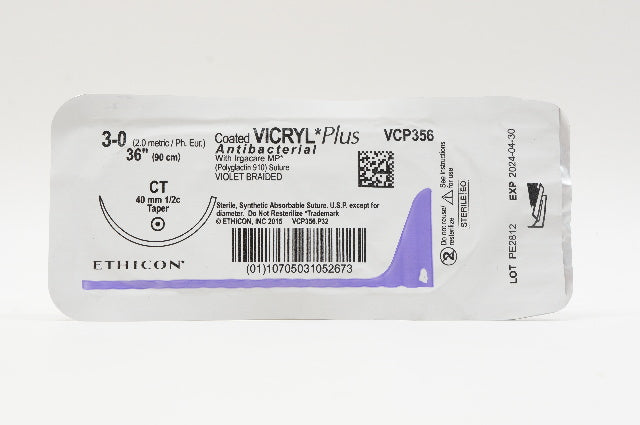 - Ethicon VCP356 3-0 VICRYL Plus, CT, 40mm 1/2c Taper, 36inch