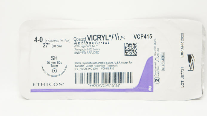 - Ethicon VCP415 4-0 Coated Vicryl Plus Stre SH 26mm 1/2c Taper, 27inch (x)