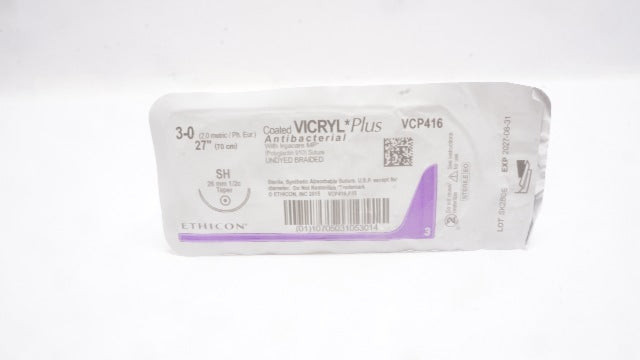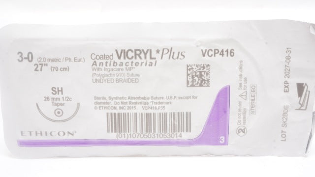 - Ethicon VCP416 3-0 Vicryl Plus Antibacterial Stre SH 26mm 1/2c Taper, 27inch
