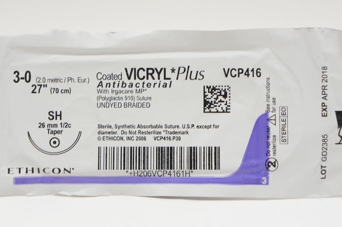 - Ethicon VCP416 3-0 VICRYL Plus, SH, 26mm 1/2c Taper, 27inch (x)