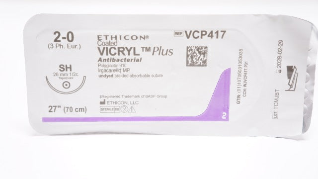 - Ethicon VCP417 2-0 Coated VICRYL Plus Stre SH 26mm 1/2c Taperpoint, 27inch