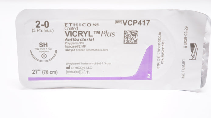 - Ethicon VCP417 2-0 VICRYL Plus, SH, 26mm 1/2c Taper, 27inch