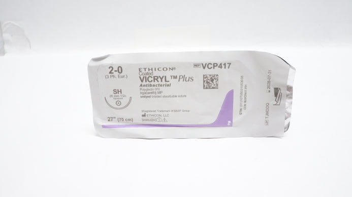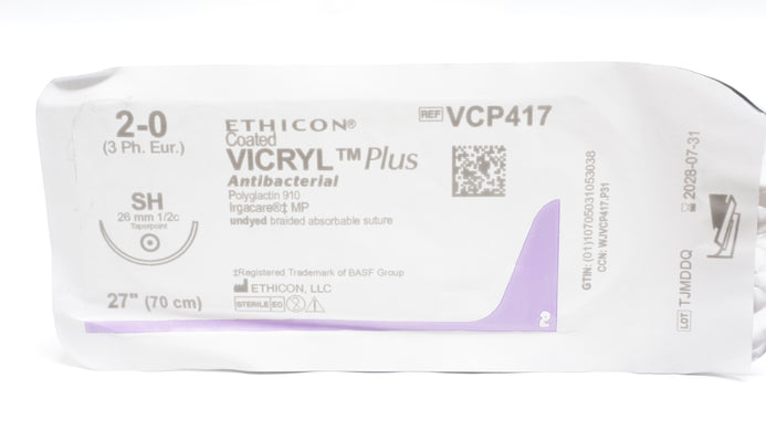 - Ethicon VCP417 2-0 VICRYL Plus, SH, 26mm 1/2c Taper, 27inch