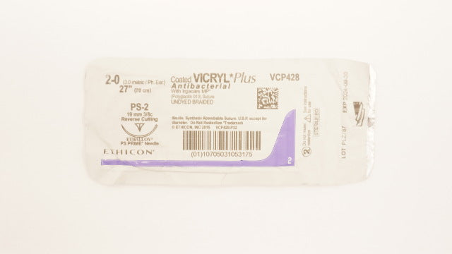 Ethicon VCP428 2-0 Coated Vicryl Plus Antibacterial With Irgacare MP (Polyglactin 910) Suture Undyed Braided 27 inch PS-2 19mm 3/8c Reverse Cutting Ethalloy PS Prime Needle