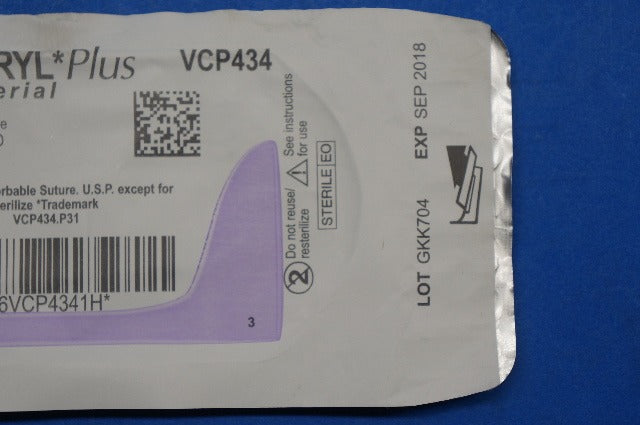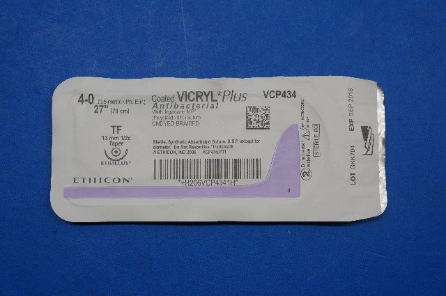 - Ethicon VCP434 4-0 VICRYL Plus, TF 13mm 1/2c Taper, Undyed Braided, 27inch