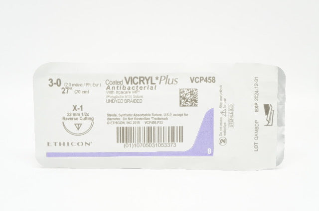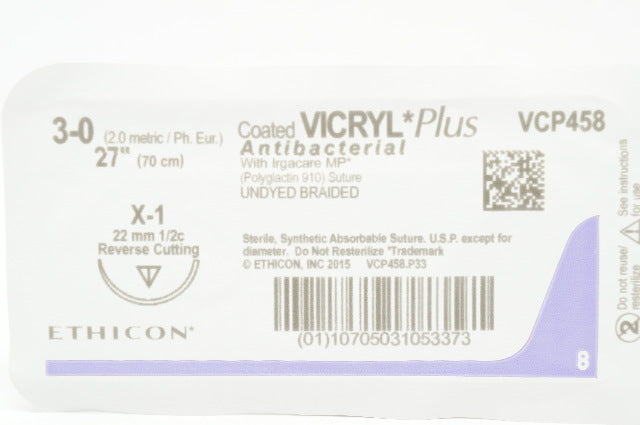 - Ethicon VCP458 3-0 Vicryl Plus X-1 22mm 1/2c 27inch