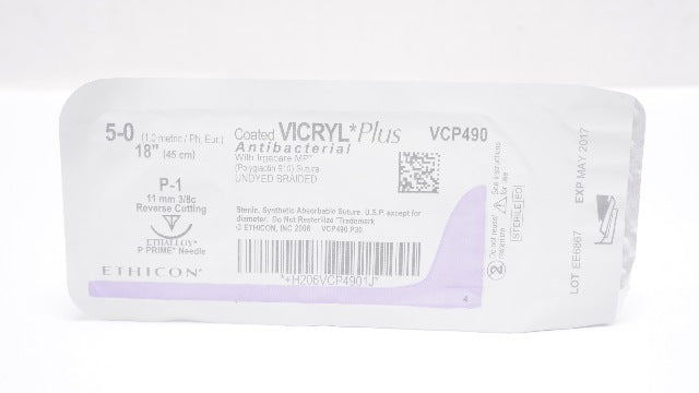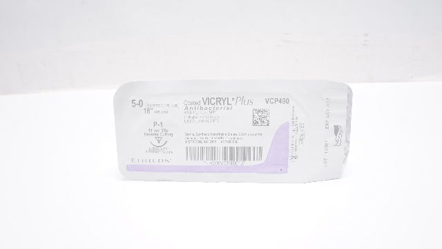 Ethicon VCP490 5-0 Coated VICRYL Plus Antibacterial With Irgacare MP Polyglactin 910 Undyed Braided Stre P-1 11mm 3/8c Reverse Cutting, 18inch