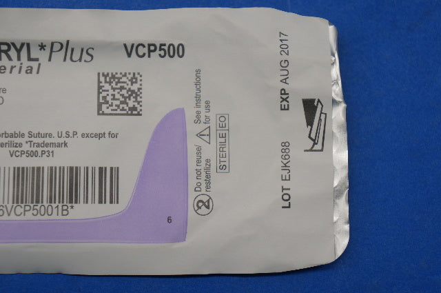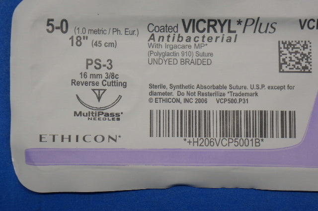 Ethicon VCP500 VICRYL Plus, PS-3 16mm 3/8c Reverse Cutting, Undyed Braided, 18", Size 5-0