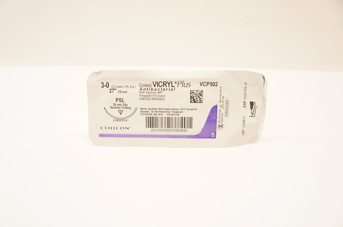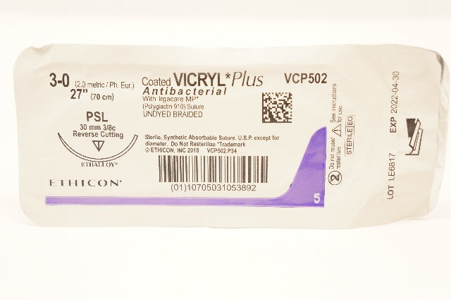 Ethicon VCP502 3-0 Coated Vicryl Plus Antibacterial With Irgacare MP Polyglactin 910 Suture Undyed Braided PSL 30mm 3/8c Reverse Cutting, 27inch