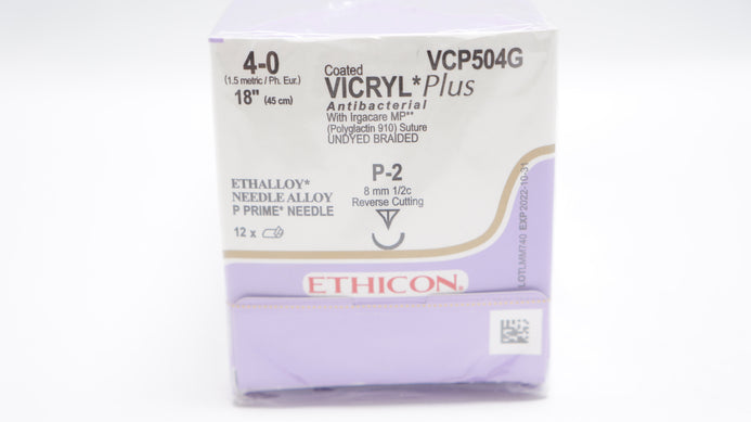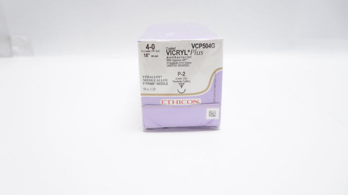 Ethicon VCP504G 4-0 VICRYL Plus P-2 8mm 1/2c Reverse Cutting 18inch(x)-Box of 12