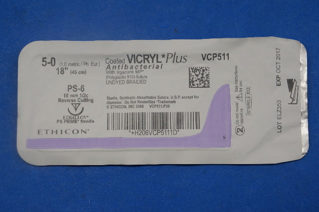 - Ethicon VCP511 5-0 VICRYL Plus, PS-6 10mm 1/2c Reverse Cutting, 18
