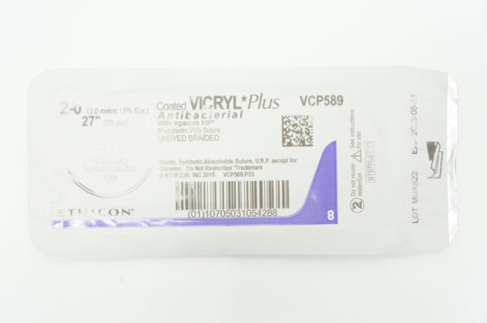 Ethicon VCP589 2-0 Coated VICRYL Plus Antibacterial With Irgacare MP Polyglactin 910 Suture Undyed Braided FSL 30mm 3/8c Reverse Cutting 27inch
