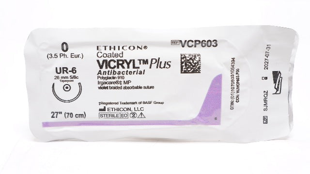 Ethicon VCP603 0 Coated VICRYL Plus Antibacterial Polyglactin 910 Irgacare MP Violet braided Absorbable Suture UR-6 26 mm 5/8c Taperpoint 27 inch