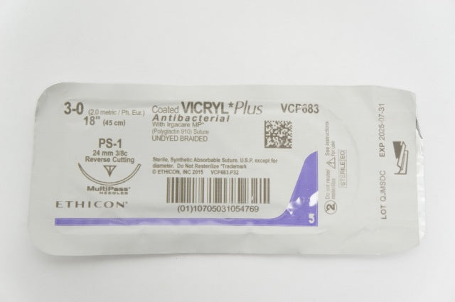 Ethicon VCP683 3-0 Coated Vicryl Plus, PS-1, 24mm 3/8c Reverse Cutting, 18inch