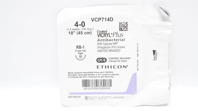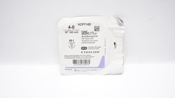 Ethicon VCP714D 4-0 Coated VICRYL Plus Antibacterial With Irgacare MP Polyglactin 910 Suture Undyed Braided RB-1 17mm 1/2c Taper, 18inch
