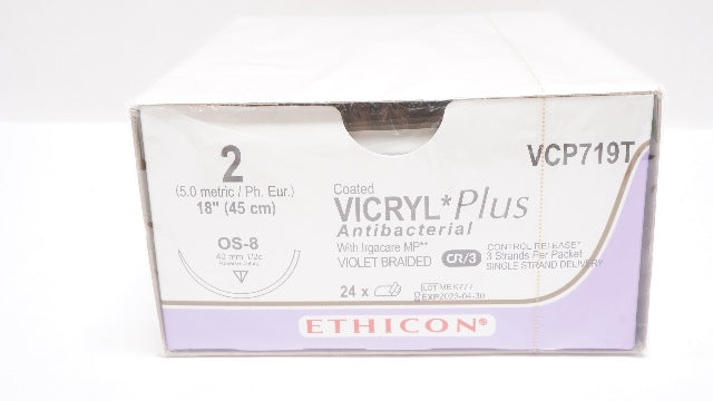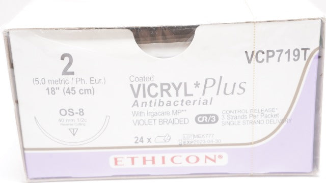 Ethicon VCP719T 2 Coated Vicryl Plus Antibacterial With Irgacare MP Polyglactin 910 Violet Braided Suture OS-8 40mm 1/2c Reverse Cutting 18inch