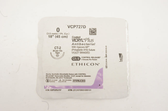 Ethicon VCP727D 0 Coated VICRYL Plus Antibacterial With Irgacare MP Polyglactin 910 Suture Violet Braidedc CT-2 26mm 1/2c Taper, 18inch