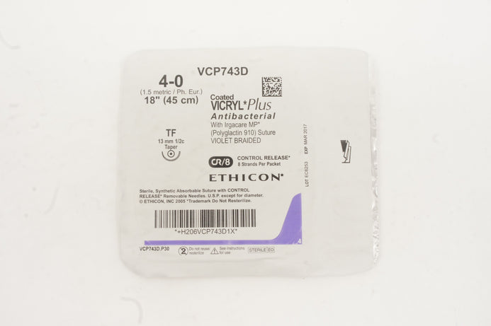 - Ethicon VCP743D 4-0 VICRYL Plus TF 13mm 1/2c Taper, 18inch (x)