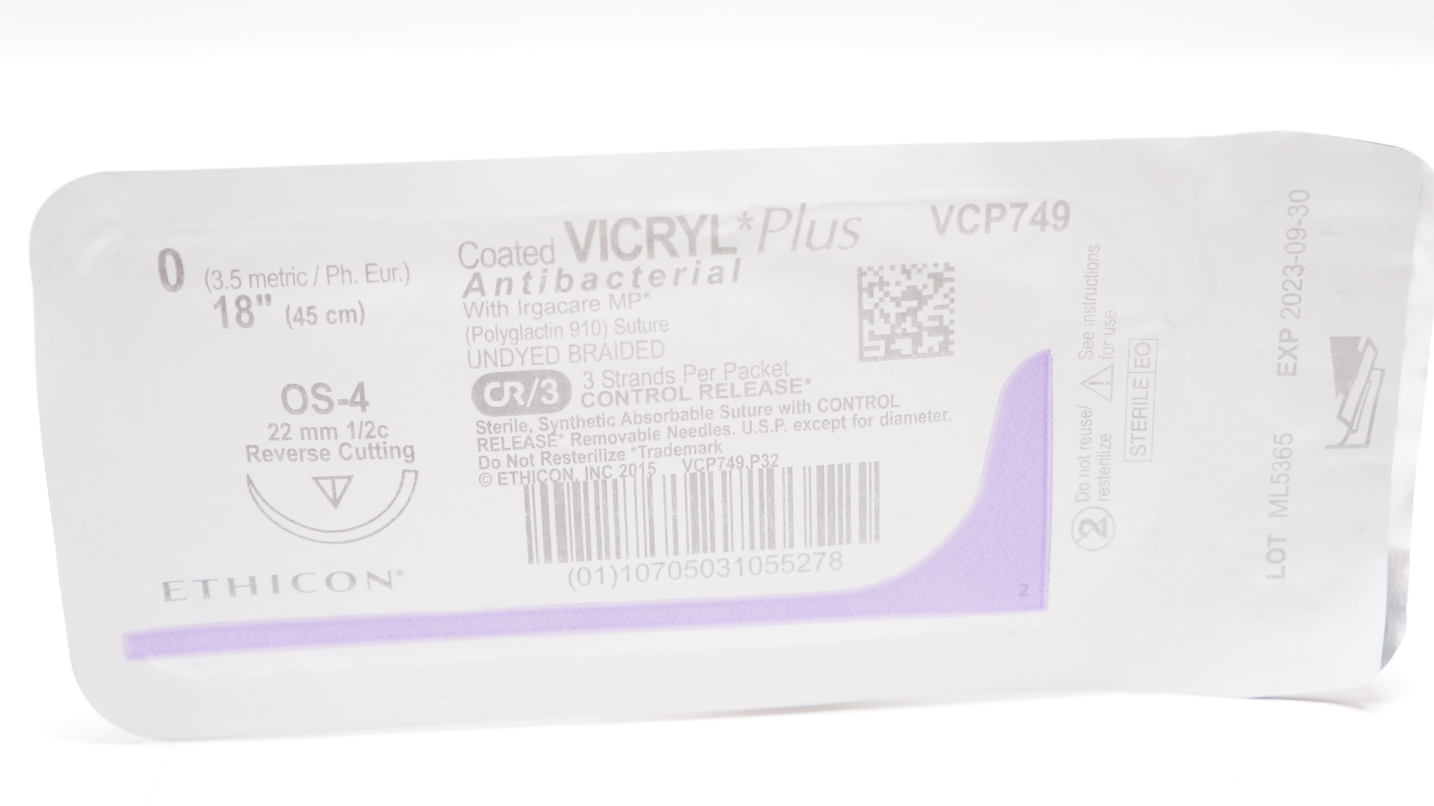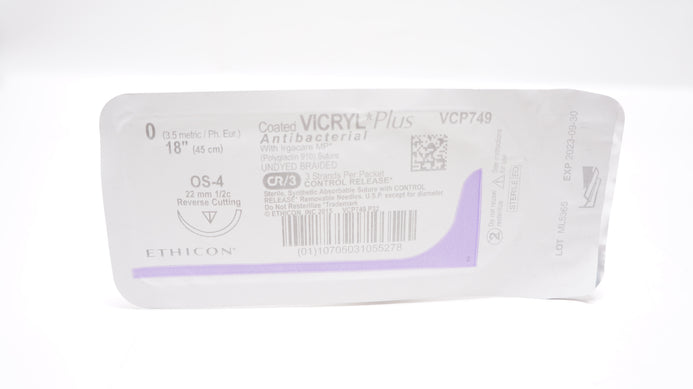 - Ethicon VCP749 0 Coated VICRYL OS-4 22mm 1/2c Reverse Cutting, 18inch (x)