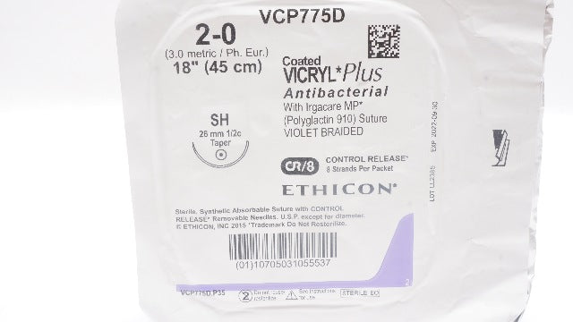 - Ethicon VCP775D 2-0 Coated Vicryl Plus, SH, 26mm 1/2c Taper, 18 inch (x)